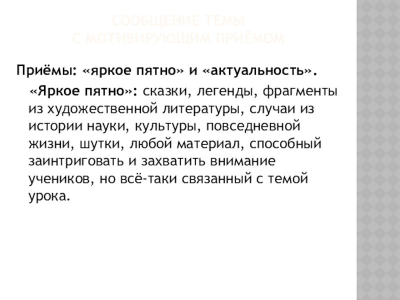 пятно»: сказки, легенды, фрагменты из художественной литературы, случаи из истории науки, культуры, повседневной жизни, шутки, любой материал, способный заинтриговать и захватить внимание учеников, но всё-таки связанный с темой урока.