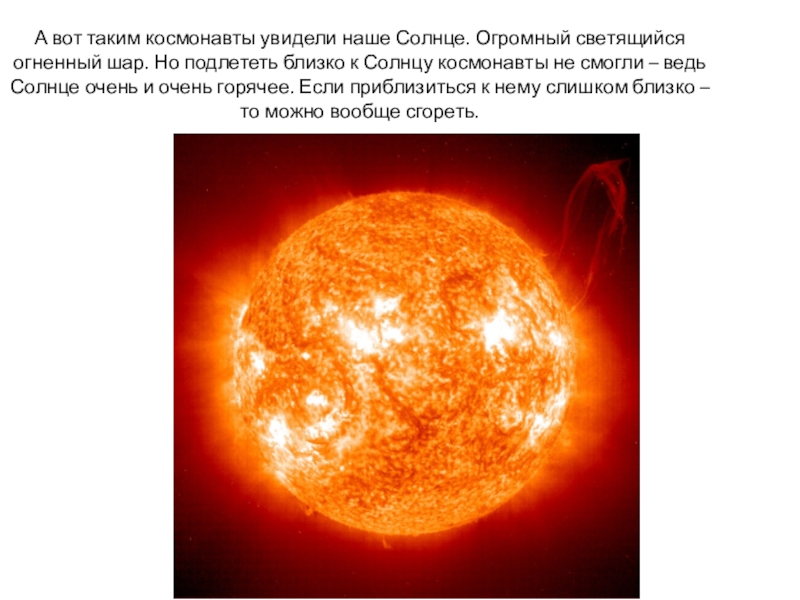 Слайд 13А вот таким космонавты увидели наше Солнце. Огромный светящийся огненный шар.