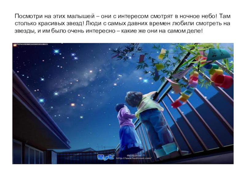 Посмотри на этих малышей – они с интересом смотрят в ночное небо! Там столько красивых звезд! Люди с самых давних времен любили смотреть на звезды, и им было очень интересно – какие же они на самом