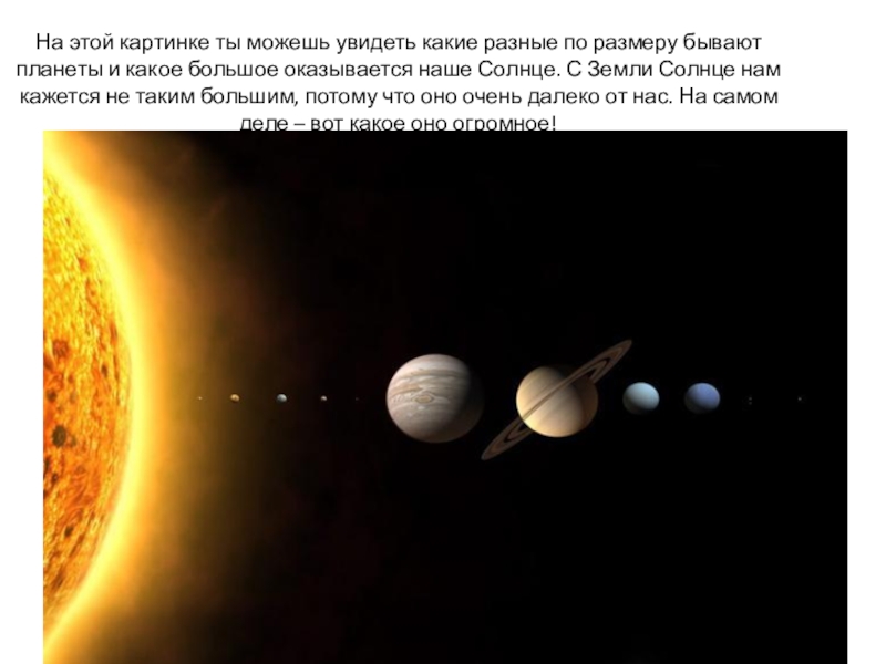 планеты и какое большое оказывается наше Солнце. С Земли Солнце нам кажется не таким большим, потому что оно очень далеко от нас. На самом деле – вот какое оно огромное!