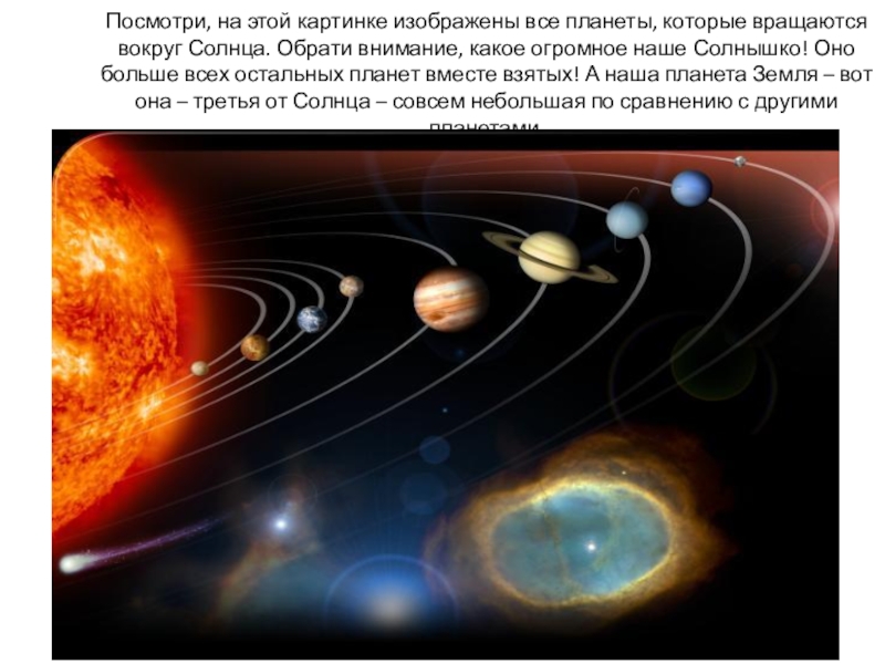 Посмотри, на этой картинке изображены все планеты, которые вращаются вокруг Солнца. Обрати внимание, какое огромное наше Солнышко!