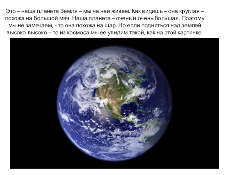 видишь – она круглая – похожа на большой мяч. Наша планета – очень и очень большая. Поэтому мы не замечаем, что она похожа на шар. Но если подняться над землей высоко-высоко – то из космоса мы ее увидим такой, как на этой картинке.