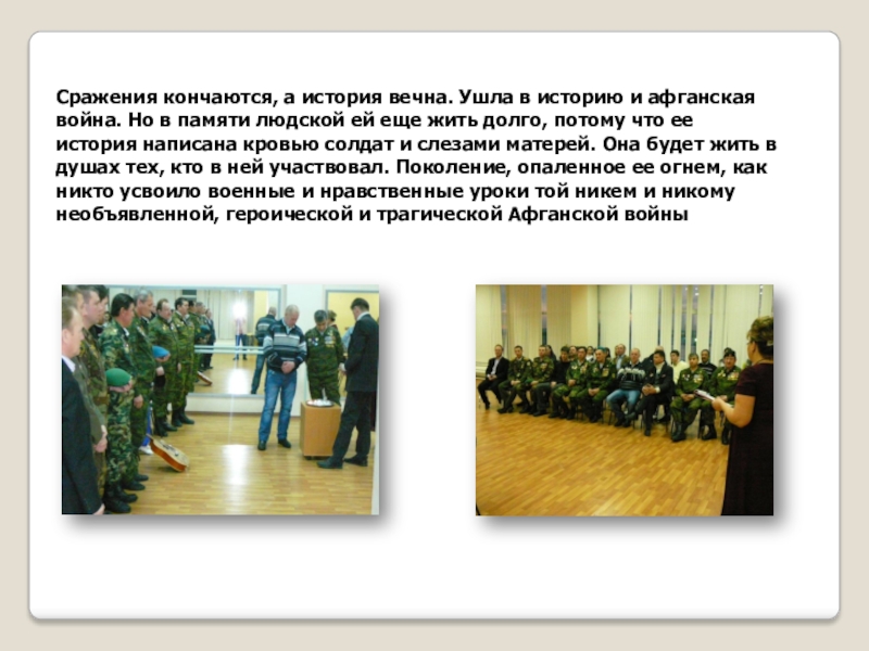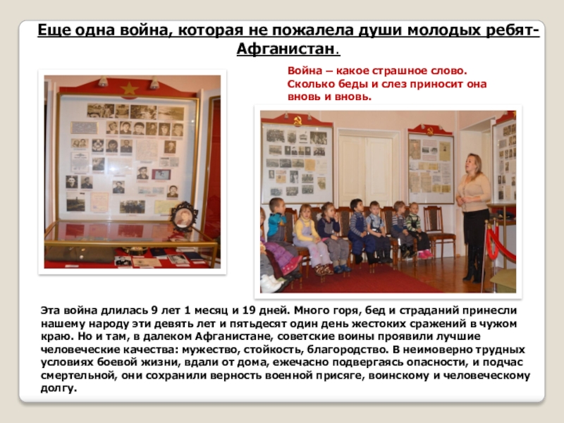Эта война длилась 9 лет 1 месяц и 19 дней. Много горя, бед и страданий принесли нашему народу эти девять лет и пятьдесят один день жестоких сражений в чужом краю. Но и там, в далеком Афганистане, советские воины проявили лучшие человеческие качества: мужество, стойкость, благородство. В неимоверно трудных условиях боевой жизни, вдали от дома, ежечасно подвергаясь опасности, и подчас смертельной, они сохранили верность военной присяге, воинскому и человеческому долгу.