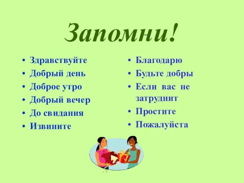 Запомни!ЗдравствуйтеДобрый деньДоброе утроДобрый вечерДо свиданияИзвинитеБлагодарюБудьте добрыЕсли вас не затруднитПроститеПожалуйста