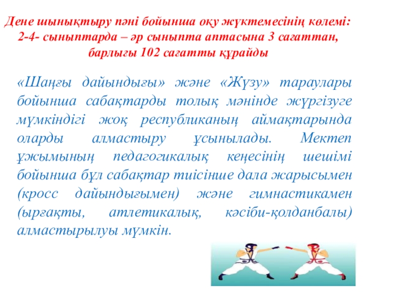 «Шаңғы дайындығы» және «Жүзу» тараулары бойынша сабақтарды толық мәнінде жүргізуге мүмкіндігі жоқ республиканың аймақтарында оларды алмастыру ұсынылады. Мектеп ұжымының педагогикалық кеңесінің шешімі бойынша бұл сабақтар тиісінше дала жарысымен (кросс дайындығымен) және гимнастикамен (ырғақты, атлетикалық, кәсіби-қолданбалы) алмастырылуы мүмкін.