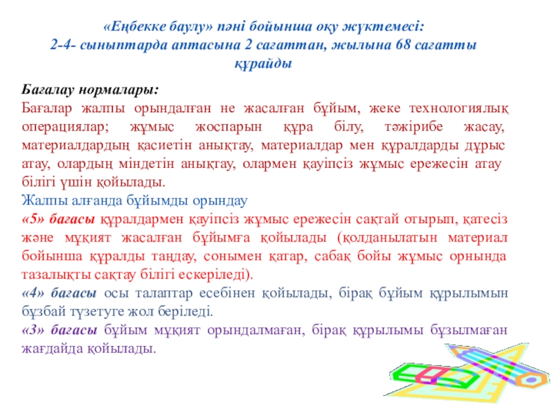 «5» бағасы құралдармен қауіпсіз жұмыс ережесін сақтай отырып, қатесіз және мұқият жасалған бұйымға қойылады (қолданылатын материал бойынша құралды таңдау, сонымен қатар, сабақ бойы жұмыс орнында тазалықты сақтау білігі ескеріледі).