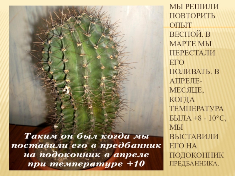 Слайд 3 Мы решили повторить опыт весной. В марте мы перестали его поливать.