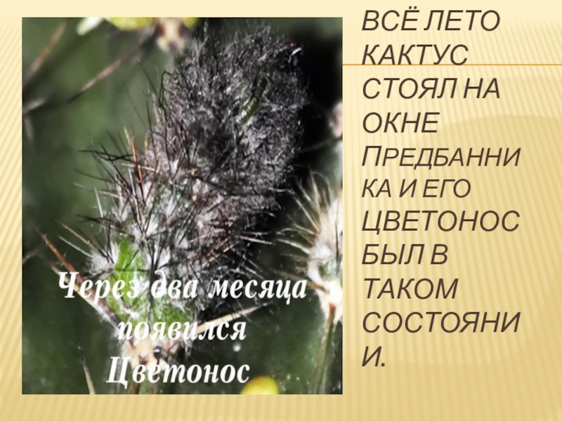 Слайд 4Всё лето кактус стоял на окне предбанника и его