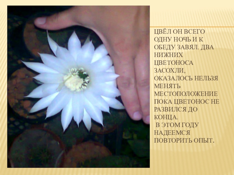 Слайд 9 Цвёл он всего одну ночь и к обеду завял. Два нижних
