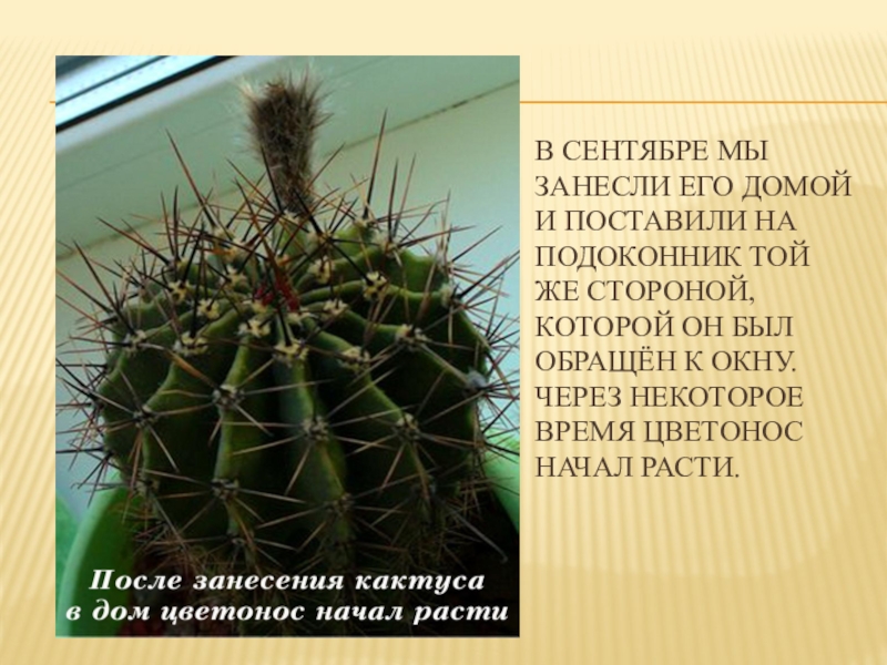 Слайд 5В сентябре мы занесли его домой и поставили на подоконник той