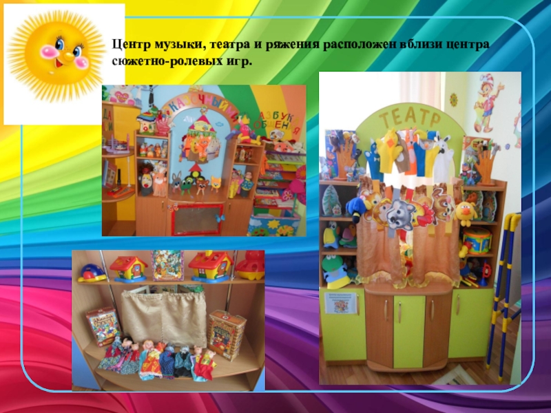 Слайд 22Центр музыки, театра и ряжения расположен вблизи центра сюжетно-ролевых игр.