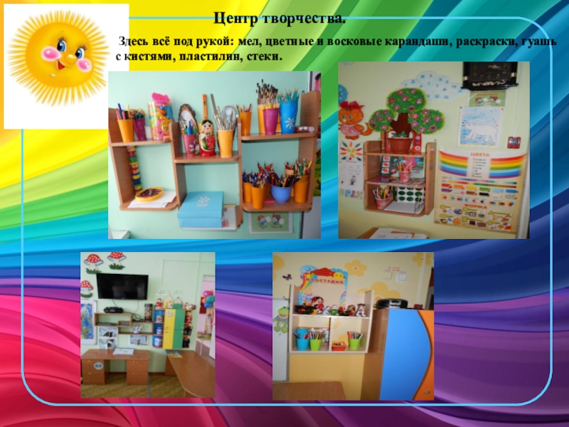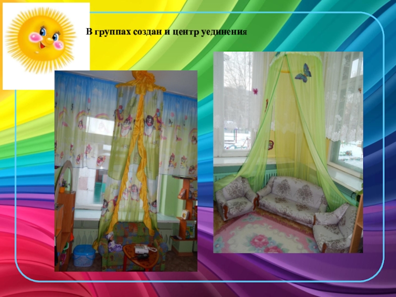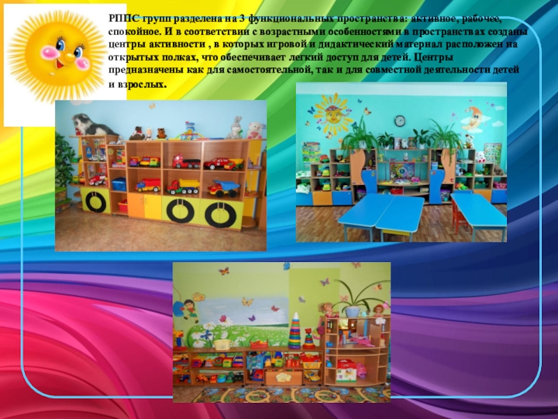 Слайд 12РППС групп разделена на 3 функциональных пространства: активное, рабочее, спокойное. И