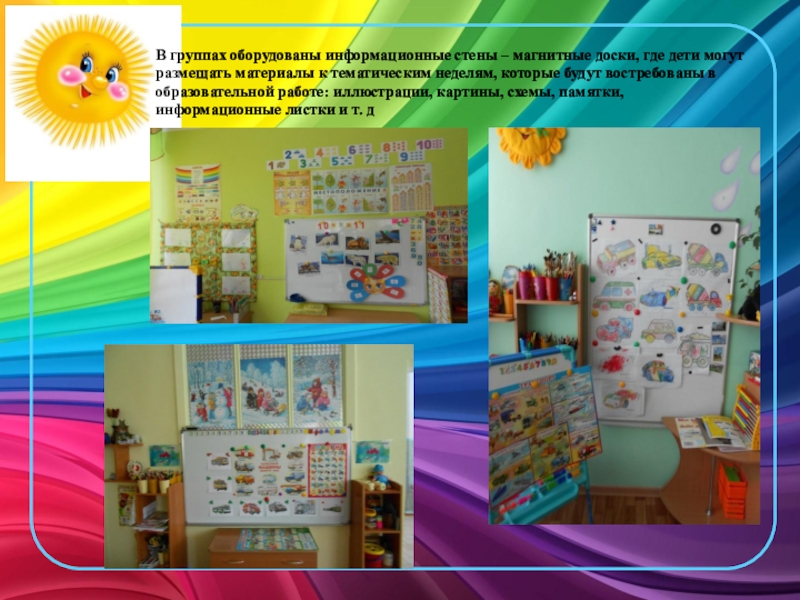 Слайд 13В группах оборудованы информационные стены – магнитные доски, где дети могут