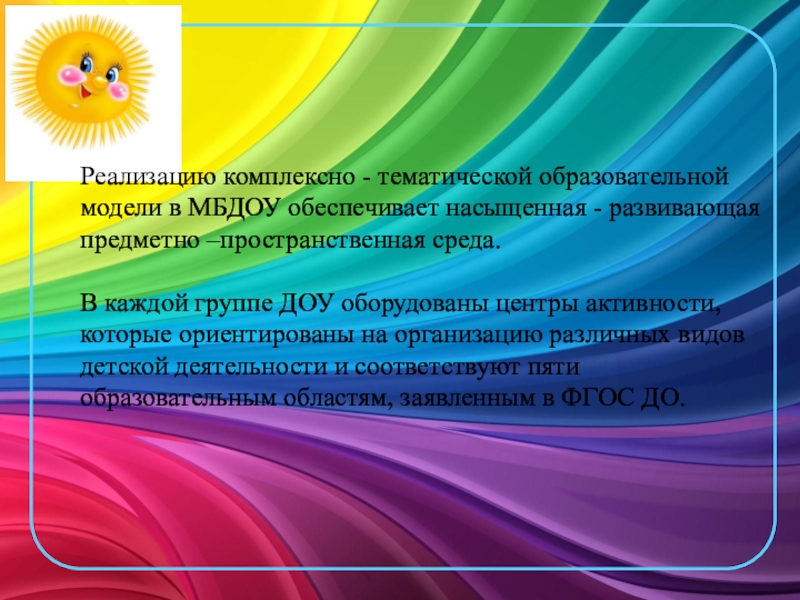 Слайд 8Реализацию комплексно - тематической образовательной модели в МБДОУ обеспечивает насыщенная -