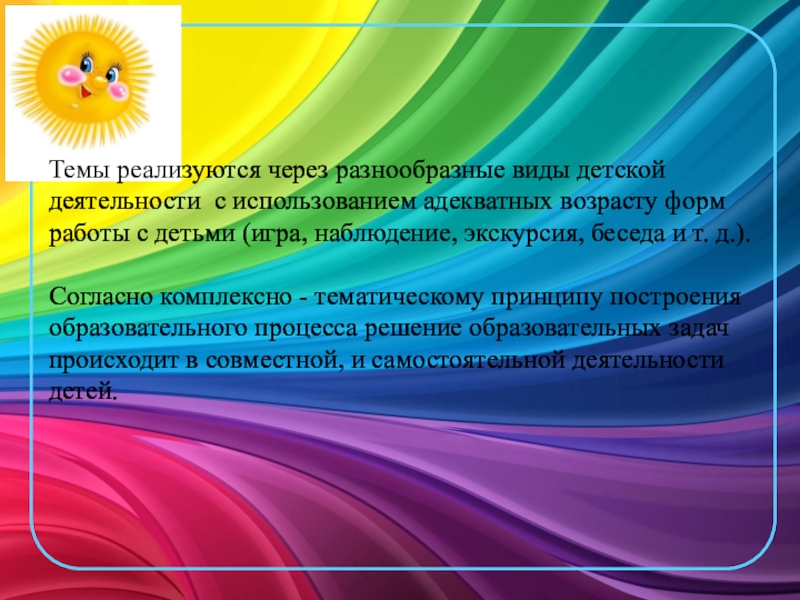 Слайд 6Темы реализуются через разнообразные виды детской деятельности с использованием адекватных возрасту