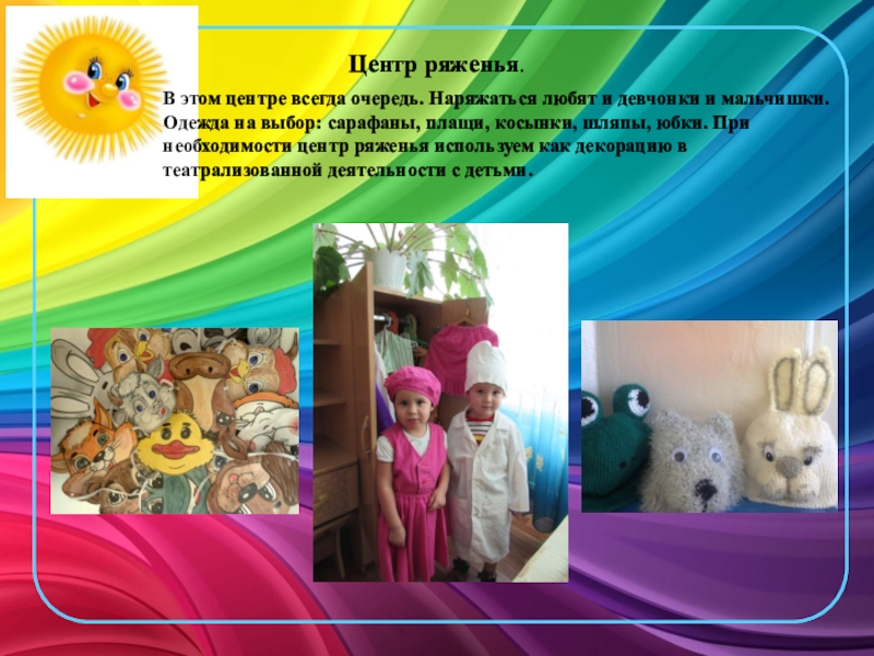 мальчишки. Одежда на выбор: сарафаны, плащи, косынки, шляпы, юбки. При необходимости центр ряженья используем как декорацию в театрализованной деятельности с детьми.