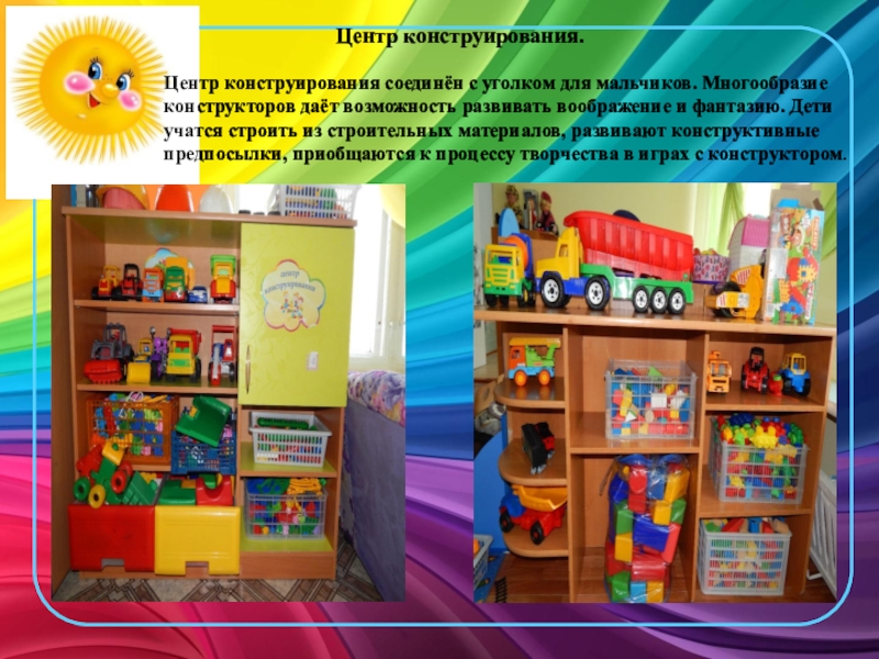 Центр конструирования соединён с уголком для мальчиков. Многообразие конструкторов даёт