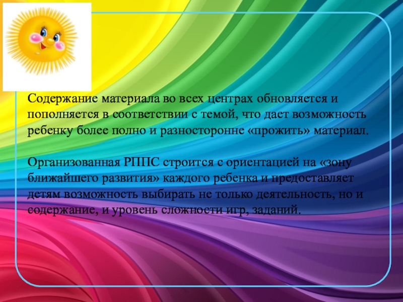 Организованная РППС строится с ориентацией на «зону ближайшего развития» каждого ребенка и предоставляет детям возможность выбирать не только деятельность, но и содержание, и уровень сложности игр, заданий.