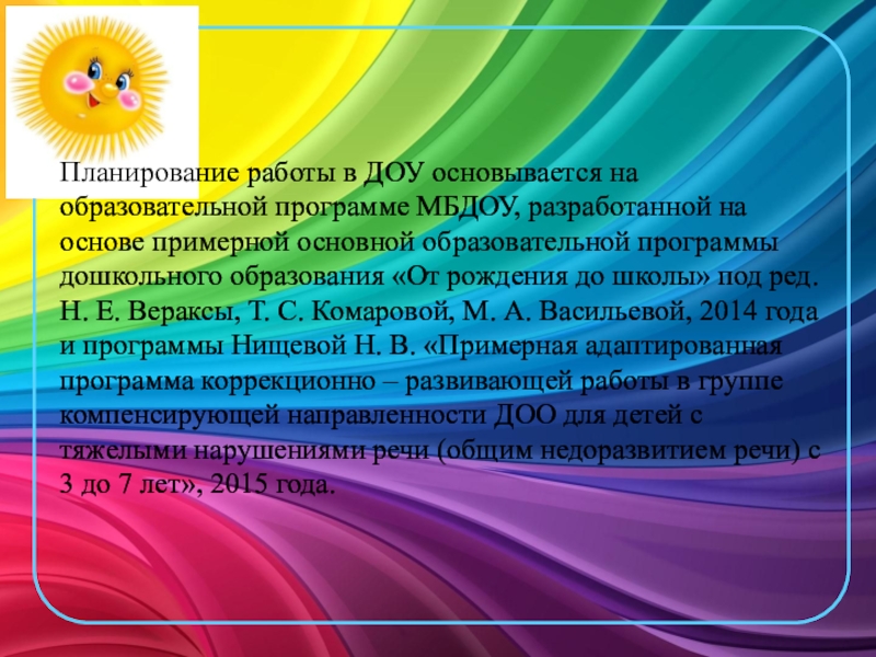 Слайд 3Планирование работы в ДОУ основывается на образовательной программе МБДОУ, разработанной на