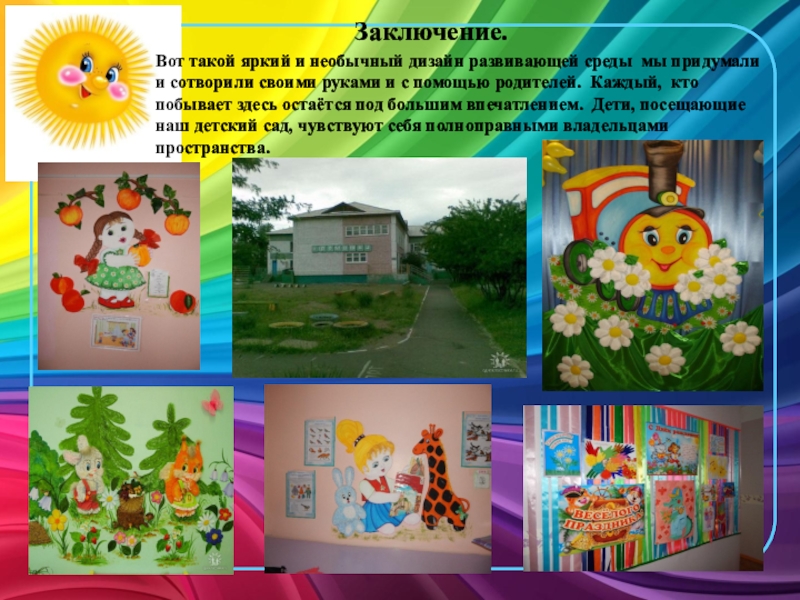 сотворили своими руками и с помощью родителей. Каждый, кто побывает здесь остаётся под большим впечатлением. Дети, посещающие наш детский сад, чувствуют себя полноправными владельцами пространства.