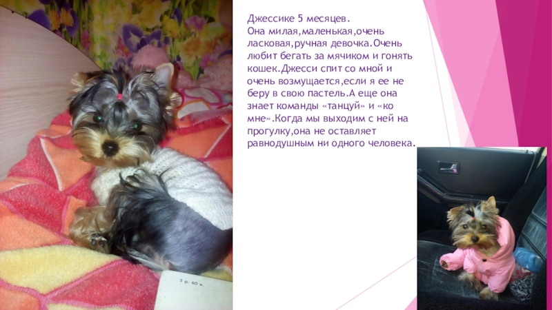 Джессике 5 месяцев.Она милая,маленькая,очень ласковая,ручная девочка.Очень любит бегать за мячиком и гонять кошек.Джесси спит со мной и очень возмущается,если я ее не беру в свою пастель.А еще она знает команды «танцуй» и «ко мне».Когда мы выходим