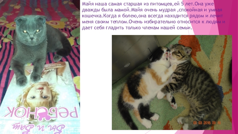 мамой.Майя очень мудрая ,спокойная и умная кошечка.Когда я болею,она всегда находится рядом и лечит меня своим теплом.Очень избирательно относится к людям и дает себя гладить только членам нашей семьи.