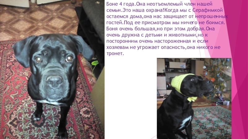 Слайд 4Боне 4 года.Она неотъемлемый член нашей семьи.Это наша охрана!Когда мы с