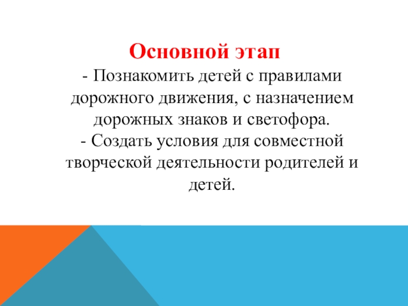 Слайд 9Основной этап - Познакомить детей с правилами дорожного движения, с назначением дорожных