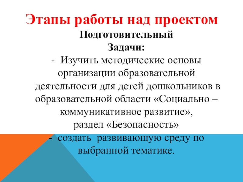 Слайд 8Этапы работы над проектом Подготовительный Задачи: - Изучить методические основы организации образовательной деятельности для
