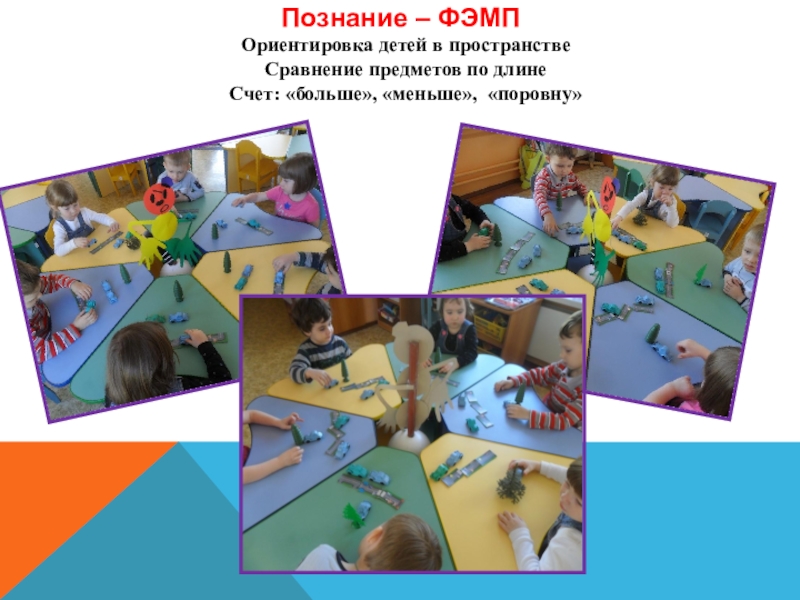 Слайд 17Познание – ФЭМП Ориентировка детей в пространстве Сравнение предметов по длине