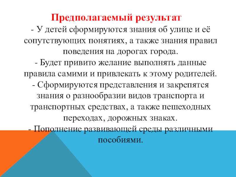 Слайд 6Предполагаемый результат - У детей сформируются знания об улице и её сопутствующих