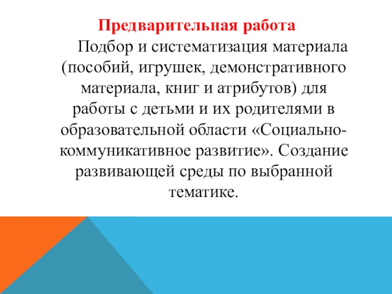 Слайд 7Предварительная работа Подбор и систематизация материала (пособий, игрушек, демонстративного материала,