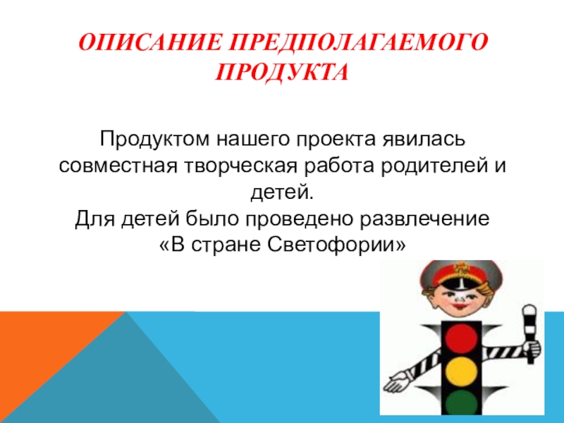 Описание предполагаемого продукта Продуктом нашего проекта явилась совместная творческая работа родителей и детей.Для детей было проведено развлечение «В стране Светофории»