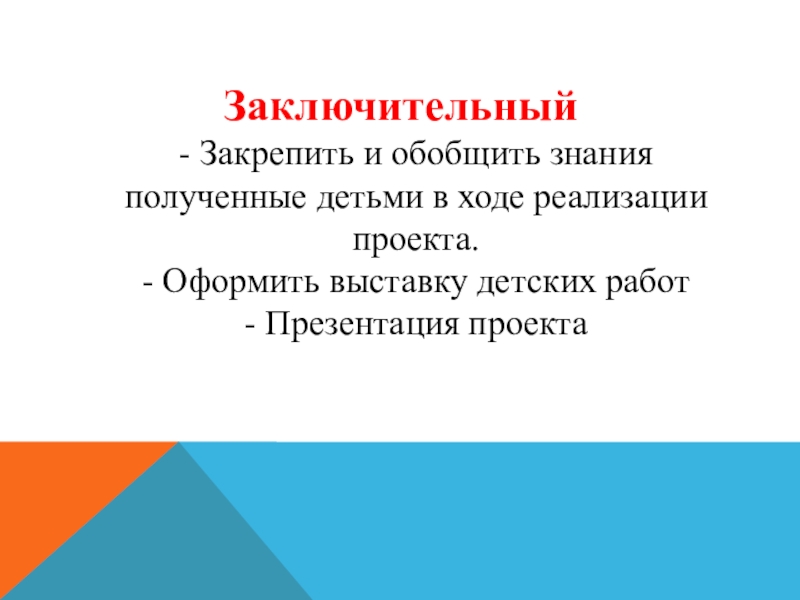 Слайд 10Заключительный - Закрепить и обобщить знания полученные детьми в ходе реализации проекта. -