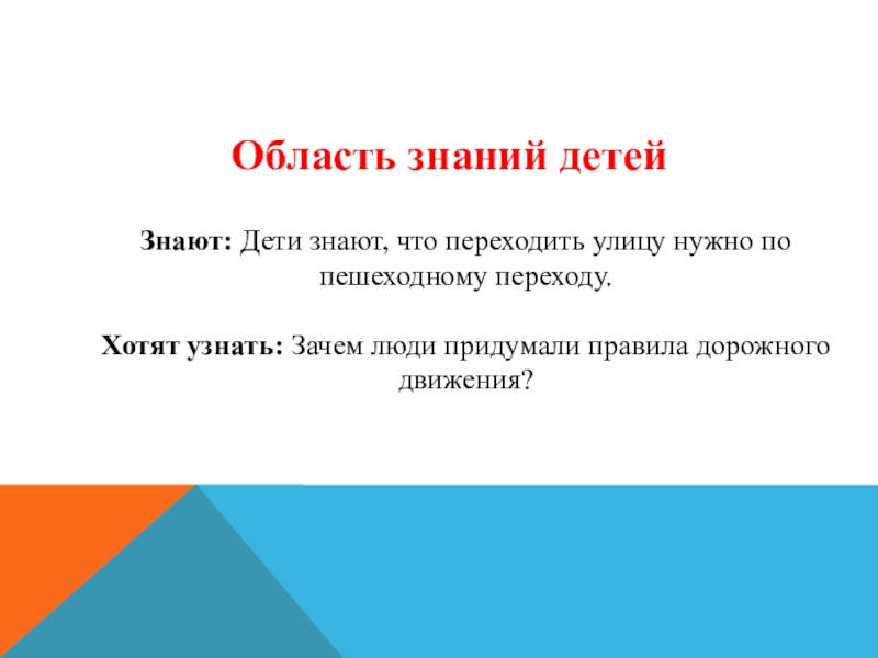 Слайд 5Область знаний детей Знают: Дети знают, что переходить улицу нужно по пешеходному