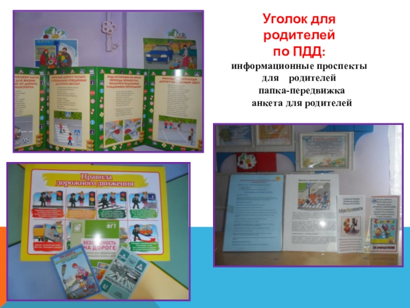 Слайд 12Уголок для родителей по ПДД: информационные проспекты для родителей папка-передвижка анкета