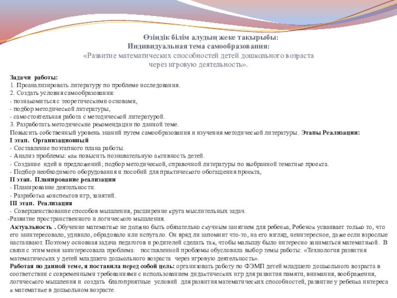 Актуальность . Обучение математике не должно быть обязательно скучным занятием для ребенка, Ребенок усваивает только то, что его заинтересовало, удивило, обрадовало или испугало. Он вряд ли запомнит что-то, на его взгляд, неинтересное, даже если взрослые настаивают. Поэтому основная задача педагогов и родителей сделать так, чтобы малышу было интересно заниматься математикой. В связи с этим меня заинтересовала проблема: поставленной проблемы обусловила выбор темы работы: «Технология развития математических у детей младшего дошкольного возраста через игровую деятельность».