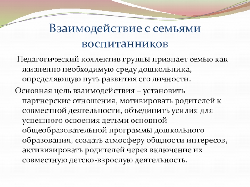 Основная цель взаимодействия – установить партнерские отношения, мотивировать родителей к совместной деятельности, объединить усилия для успешного освоения детьми основной общеобразовательной программы дошкольного образования, создать атмосферу общности интересов, активизировать родителей через включение их совместную детско-взрослую деятельность.