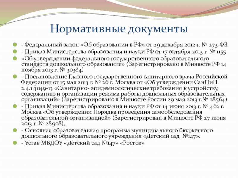 - Постановление Главного государственного санитарного врача Российской Федерации от 15 мая 2013 г. № 26 г. Москва от «Об утверждении СанПиН 2.4.1.3049-13 «Санитарно- эпидемиологические требования к устройству, содержанию и организации режима работы дошкольных образовательных организаций» (Зарегистрировано в Минюсте России 29 мая 2013 г.№ 28564)