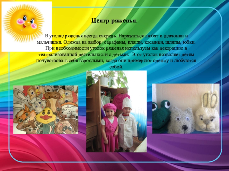 мальчишки. Одежда на выбор: сарафаны, плащи, косынки, шляпы, юбки. При необходимости уголок ряженья используем как декорацию в театрализованной деятельности с детьми. Этот уголок позволяет детям почувствовать себя взрослыми, когда они примеряют одежду и любуются собой.
