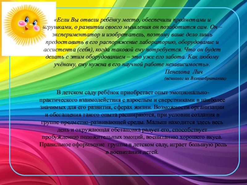 В детском саду ребёнок приобретает опыт эмоционально-практического взаимодействия с взрослым и сверстниками в наиболее значимых для его развития, сферах жизни. Возможности организации и обогащения такого опыта расширяются, при условии создания в группе предметно-развивающей среды. Малыш находится здесь весь день и окружающая обстановка радует его, способствует пробуждению положительных эмоций, воспитанию хорошего вкуса. Правильное оформление группы в детском саду, играет большую роль в воспитании детей.
