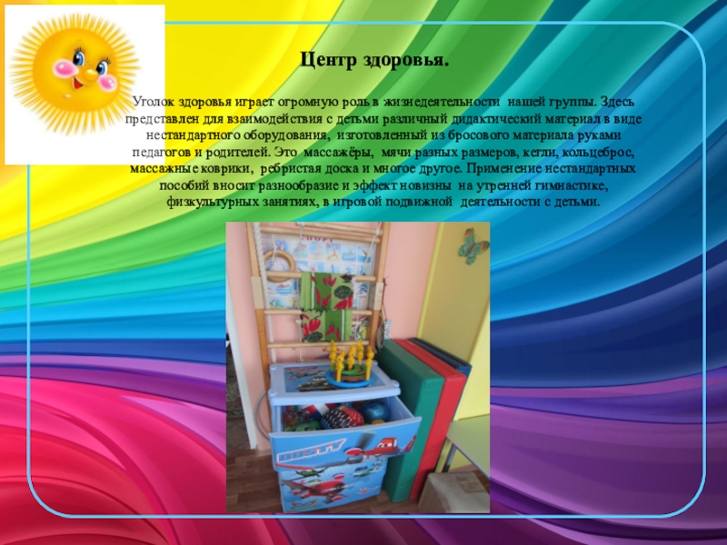 представлен для взаимодействия с детьми различный дидактический материал в виде нестандартного оборудования, изготовленный из бросового материала руками педагогов и родителей. Это массажёры, мячи разных размеров, кегли, кольцеброс, массажные коврики, ребристая доска и многое другое. Применение нестандартных пособий вносит разнообразие и эффект новизны на утренней гимнастике, физкультурных занятиях, в игровой подвижной деятельности с детьми.