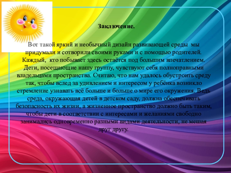 сотворили своими руками и с помощью родителей. Каждый, кто побывает здесь остаётся под большим впечатлением. Дети, посещающие нашу группу, чувствуют себя полноправными владельцами пространства. Считаю, что нам удалось обустроить среду так, чтобы вслед за удивлением и интересом у ребёнка возникло стремление узнавать всё больше и больше о мире его окружения. Ведь среда, окружающая детей в детском саду, должна обеспечивать безопасность их жизни, а жизненное пространство должно быть таким, чтобы дети в соответствии с интересами и желаниями свободно занимались одновременно разными видами деятельности, не мешая друг другу.