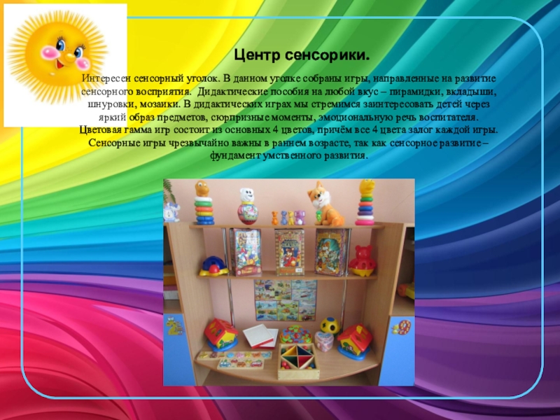 развитие сенсорного восприятия. Дидактические пособия на любой вкус – пирамидки, вкладыши, шнуровки, мозаики. В дидактических играх мы стремимся заинтересовать детей через яркий образ предметов, сюрпризные моменты, эмоциональную речь воспитателя. Цветовая гамма игр состоит из основных 4 цветов, причём все 4 цвета залог каждой игры. Сенсорные игры чрезвычайно важны в раннем возрасте, так как сенсорное развитие – фундамент умственного развития.