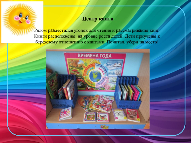 Рядом разместился уголок для чтения и рассматривания книг. Книги расположены