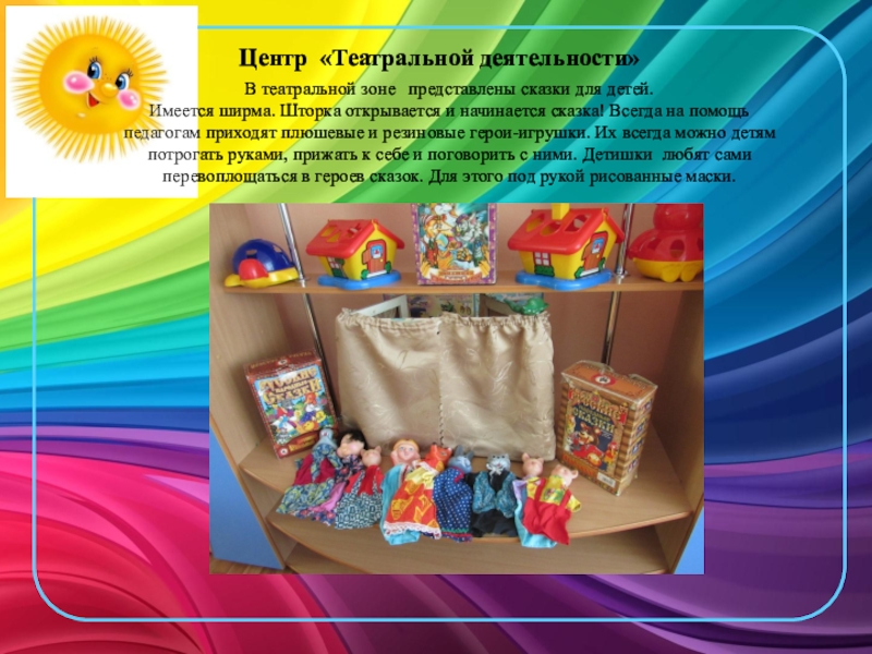 ширма. Шторка открывается и начинается сказка! Всегда на помощь педагогам приходят плюшевые и резиновые герои-игрушки. Их всегда можно детям потрогать руками, прижать к себе и поговорить с ними. Детишки любят сами перевоплощаться в героев сказок. Для этого под рукой рисованные маски.