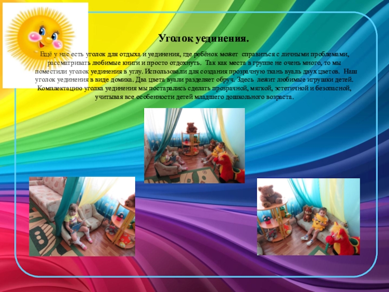 ребёнок может справиться с личными проблемами, рассматривать любимые книги и просто отдохнуть. Так как места в группе не очень много, то мы поместили уголок уединения в углу. Использовали для создания прозрачную ткань вуаль двух цветов. Наш уголок уединения в виде домика. Два цвета вуали разделяет обруч. Здесь лежит любимые игрушки детей. Комплектацию уголка уединения мы постарались сделать прозрачной, мягкой, эстетичной и безопасной, учитывая все особенности детей младшего дошкольного возраста.