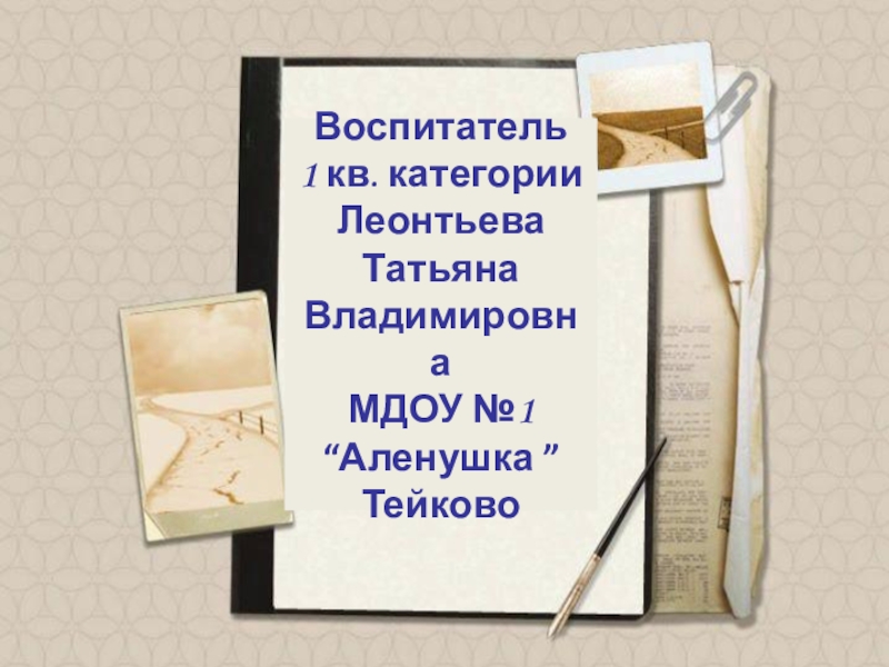 Воспитатель1 кв. категорииЛеонтьеваТатьянаВладимировнаМДОУ №1“Аленушка”ТейковоВоспитатель1 кв. категорииЛеонтьеваТатьянаВладимировнаМДОУ №1“Аленушка ”Тейково
