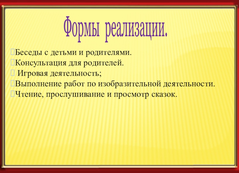 Формы реализации.Беседы с детьми и родителями. Консультация для родителей. Игровая деятельность; Выполнение работ по изобразительной деятельности. Чтение,