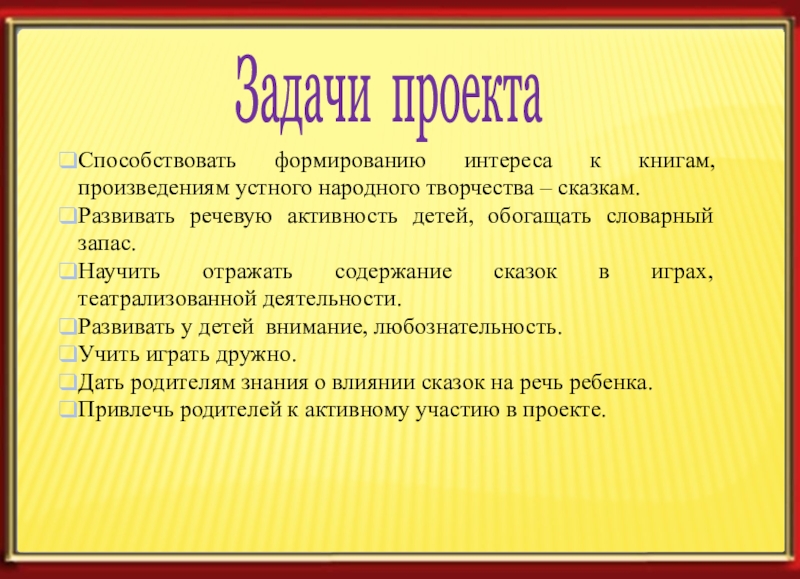 Задачи проектаСпособствовать формированию интереса к книгам, произведениям устного народного творчества – сказкам.Развивать речевую активность детей, обогащать словарный